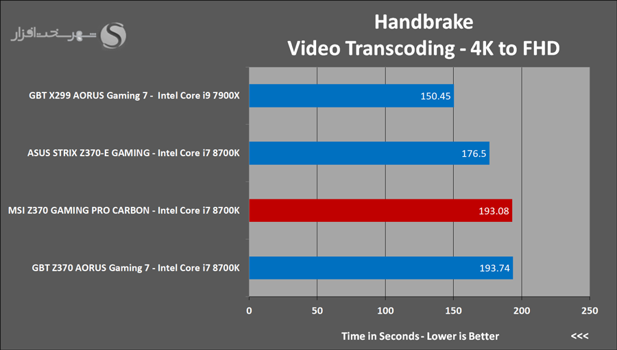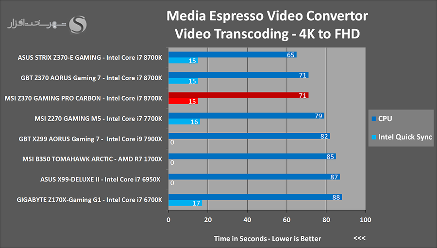 این دو نرم افزار نیز یکی از بهترین و معتبرترین تستهای سنجش کارایی سیستم در پخش و تبدیل فایلهای ویدئویی به فرمتهای مختلف به شمار میروند. پشتیبانی از مدرنترین تکنولوژیها و پربازدهترین الگوریتمها جهت تبدیل قابلهای ویدئویی با بالاترین سرعت و در عین حال باکیفیتترین حالت ممکن از مهمترین ویژگیهای این دو نرم افزار محسوب میشوند.در نرم افزار CyberLink MediaEspresso از توان CPU برای تبدیل یک فایل ویدئویی باکیفیت 2160p با فرمت MP4 و کمک AVC1 با حجم 481MB به استاندارد ویدئویی 1920x1080 در Youtube استفاده شده است. همچنین در تست نرم افزار HandBrake از توان CPU برای تبدیل یک فایل ویدئویی باکیفیت 2160p با فرمت MP4 و کمک AVC1 با حجم 481MB به ویدئویی با کیفیت 1080p با فرمت MKV و کدک H265 استفاده شده است.