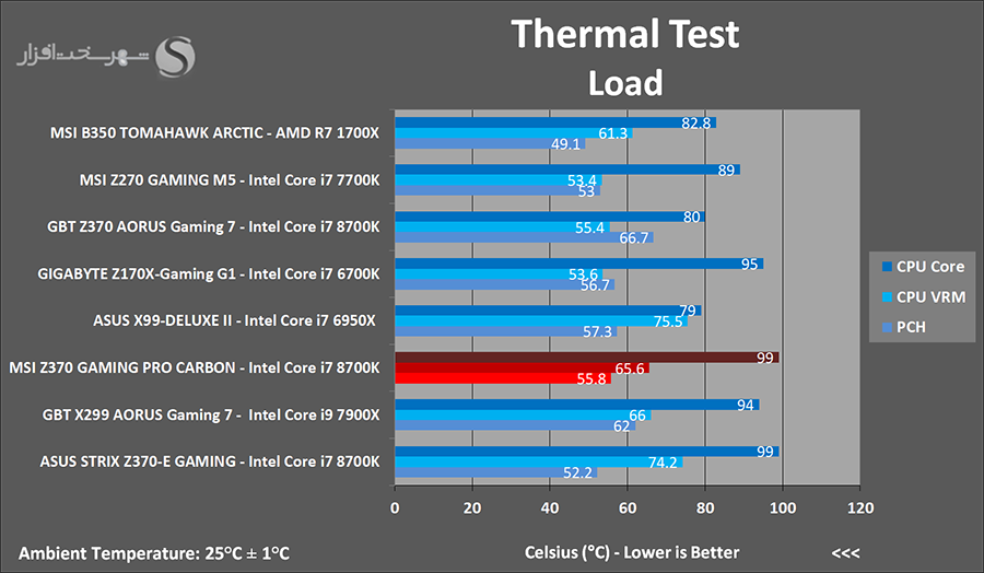 آثار Vcore پیشفرض بیشتر، در تستهای حرارتی نیز به روشنی آشکار شده و باعث افزایش حرارت پردازنده و کامپوننتهای مدار VRM پردازنده شده است. البته طبق تجارب گذشته امید داریم MSI در نسخههای بعدی Bios این ضعف را نیز پوشش دهد.
