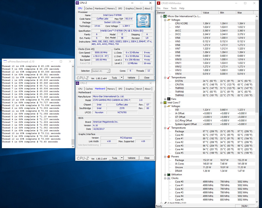 در این بخش بر خلاف روال گذشته و تعیین یک ولتاژ ثابت برای همه مادربردها تصمیم گرفتیم تا ابتدا پتانسیل اورکلاک پردازندههای با این معماری را بسنجیم. به همین منظور ابتدا تمامی پارامترها و قابلیتهای مرتبط با Power Saving را غیرفعال کردیم و در ادامه با اندکی تلاش، در فرکانس 5.0GHz و ولتاژ Vcore 1.385 به مرز بهینهترین فرکانس در برابر ولتاژ Vcore و البته توان مصرفی پردازنده رسیدیم.البته رسیدن به فرکانس های بالاتر ، حتی 5.2GHz نیز امکان پذیر بود اما نه رنج ولتاژ هسته پردازنده در محدوده ایمن بود و نه کنترل حرارت پردازنده به وسیله کولرهای متعارف امکان پذیر بود.