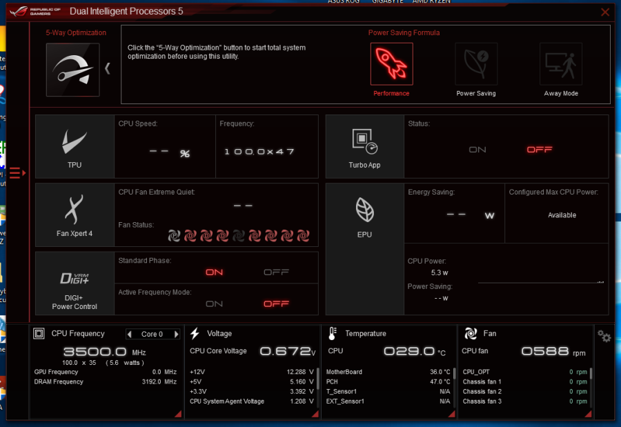 همانطور که در تصویر بالا ملاحظه میکنید، امکانات این نرم افزار در 6 تب تحت عنوانهای 5Way Optimization، TPU، EPU، DIGI+ Power Control، FAN Xpert 4 و Turbo APP طبقه بندی شدهاند. در صفحه اول سعی شده تا امکانات راهبردی برخی از تبها به همراه مانیتورینگ ولتاژ، حرارت، سرعت چرخش فنها و فرکانسهای بخشهای مختلف نظیر فرکانس هسته پردازنده، رمها و BCLK بهصورت فشرده نمایش داده شوند.