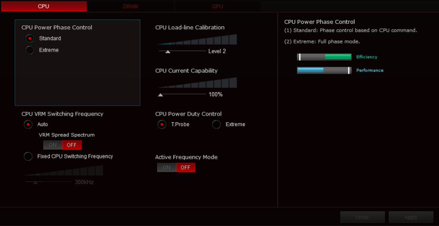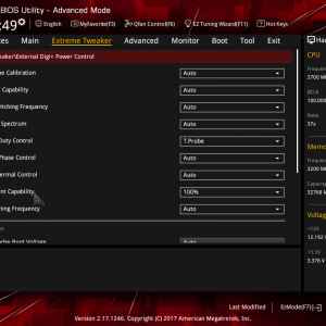 در بخش DIGI+ Power Control نیز این قابلیت فراهم شده تا برخی از تنظیمات و محدودیتهای مدار رگولاتور ولتاژ پردازنده مانند محدودیتهای جریان، توان، حرارت بهصورت دستی قابل تنظیم باشند و حتی با تنظیم فرکانس سیگنال PWM پتانسیل ارائه توانهای بیشتر از مقادیر استاندارد برای اینگونه مدارات فراهم شود.