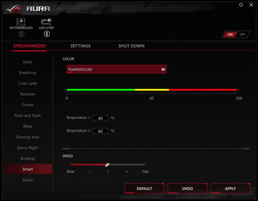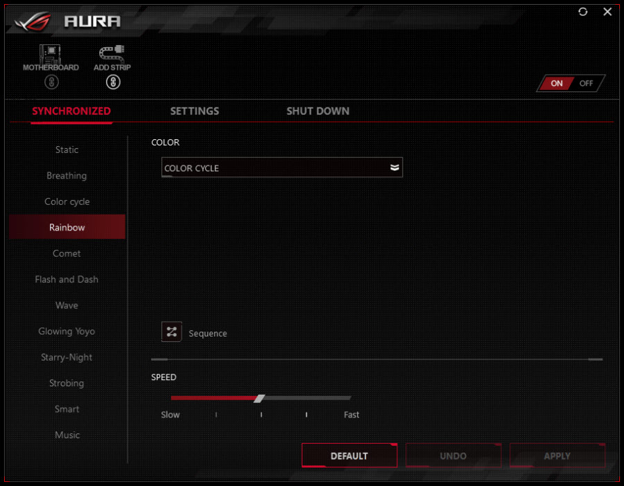 همچنین علاوه بر کنترل همزمان نورپردازی تمامی تجهیزات سازگار با AURA Sync، قابلیت کنترل هر یک از تجهیزات بهصورت مستقل نیز فراهم شده است. در جدیدترین نسخه این نرم افزار 12 جلوه مختلف برای نورپردازی این مادربرد در نظر گرفته شده که هر یک زیباییهای خاص خود را دارند.