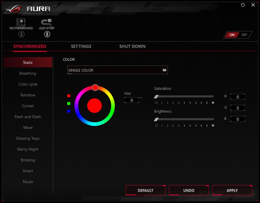 همواره نقطه قوت سامانههای نورپردازی نرم افزار کنترل و مدیریت آن است. در جدیدترین نسخه این نرم افزار قابلیت کنترل تمامی قطعات (نظیر کارت گرافیک، مادربرد و کیبورد ...) مجهز به نورپردازی AURA توسط یک نرم افزار واحد فراهم شده است. همانطور که اشاره شد و در تصویر بالا ملاحظه میکنید این امکان فراهم شده تا رنگ و جلوه نورپردازی هر یک از بخشها بهعلاوه RGB Header های تعبیه شده بر روی PCB را بهصورت جداگانه تنظیم کنید. علاوه بر این در نسخه جدید این نرم افزار این امکان تنظیم جلوه نورپردازی وضعیت آماده به کار مادربرد نیز فراهم شده است.