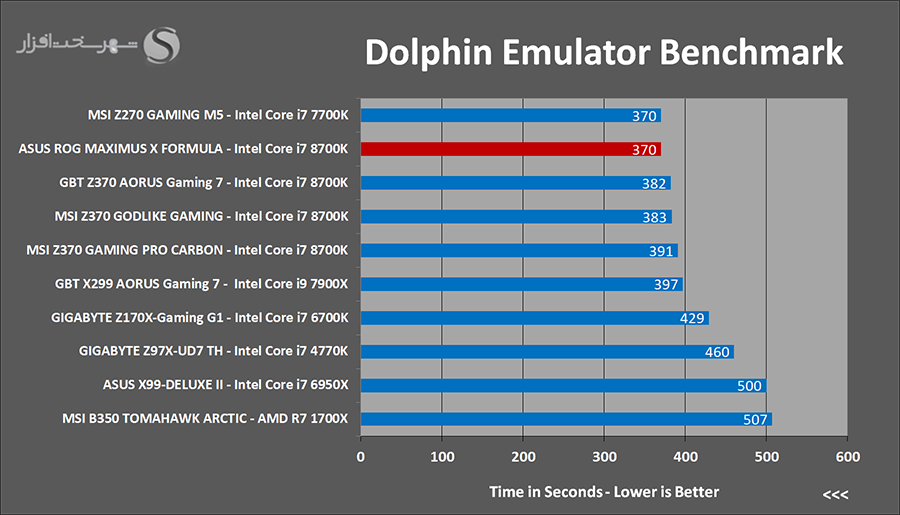 Dolphin Emulator یک شبیه ساز بسیار قدرتمند برای اجرای بازیهای کنسولهای GameCube و Wii در PC آن هم با رزولوشن 1080p میباشد. کارایی بسیار بالا به همراه پشتیبانی از بازیهای آنلاین و تحت شبکه از ویژگیهای ممتاز این شبیه ساز محسوب میشود.عملکرد Benchmark این شبیه ساز به این صورت است که در این بخش الگوریتمی استاندارد و ثابت که شامل رندر یک صحنه پیچیده 3 بعدی با استفاده از تکنیک ray tracing میشود اجرا و زمان سپری شده برای رندر کامل این صحنه ملاک کارایی پردازنده محسوب میشود. البته مد نظر داشته باشید که این نرم افزار کاملاً Multithread نیست و فرکانس و معماری هسته پردازنده مهمترین نقش را در اجرای سریعتر این شبیه ساز بازی میکنند.