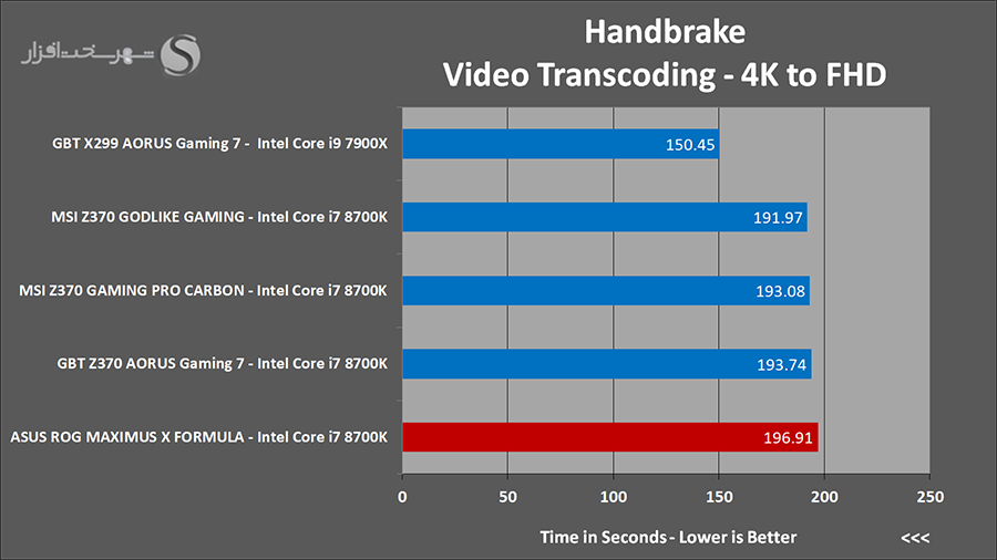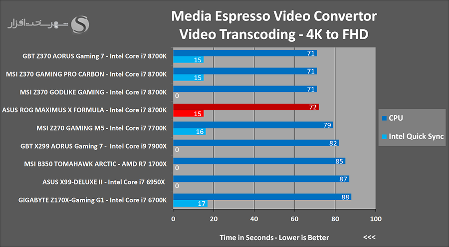 این دو نرم افزار نیز یکی از بهترین و معتبرترین تستهای سنجش کارایی سیستم در پخش و تبدیل فایلهای ویدئویی به فرمتهای مختلف به شمار میروند. پشتیبانی از مدرنترین تکنولوژیها و پربازدهترین الگوریتمها جهت تبدیل قابلهای ویدئویی با بالاترین سرعت و در عین حال باکیفیتترین حالت ممکن از مهمترین ویژگیهای این دو نرم افزار محسوب میشوند.در نرم افزار CyberLink MediaEspresso از توان CPU برای تبدیل یک فایل ویدئویی باکیفیت 2160p با فرمت MP4 و کمک AVC1 با حجم 481MB به استاندارد ویدئویی 1920x1080 در Youtube استفاده شده است. همچنین در تست نرم افزار HandBrake از توان CPU برای تبدیل یک فایل ویدئویی باکیفیت 2160p با فرمت MP4 و کمک AVC1 با حجم 481MB به ویدئویی با کیفیت 1080p با فرمت MKV و کدک H265 استفاده شده است.