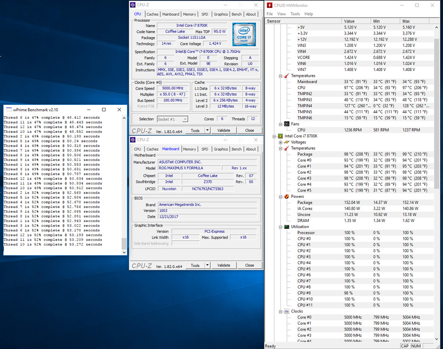 در این بخش بر خلاف روال گذشته و تعیین یک ولتاژ ثابت برای همه مادربردها تصمیم گرفتیم تا ابتدا پتانسیل اورکلاک پردازندههای با این معماری را بسنجیم. به همین منظور ابتدا تمامی پارامترها و قابلیتهای مرتبط با Power Saving را غیرفعال کردیم و در ادامه با اندکی تلاش، در فرکانس 5.0GHz و ولتاژ Vcore 1.375V به مرز بهینهترین فرکانس در برابر ولتاژ Vcore و البته توان مصرفی پردازنده رسیدیم. ناگفته نماند به دلیل فعال سازی قابلیت Load Line Calibration در حین انجام تست های پایداری ولتاژ هسته CPU حتی به مرز 1.425V نیز می رسید.البته رسیدن به فرکانس های بالاتر ، حتی 5.3GHz نیز امکان پذیر بود اما نه رنج ولتاژ هسته پردازنده در محدوده ایمن بود و نه کنترل حرارت پردازنده به وسیله کولرهای متعارف امکان پذیر بود.