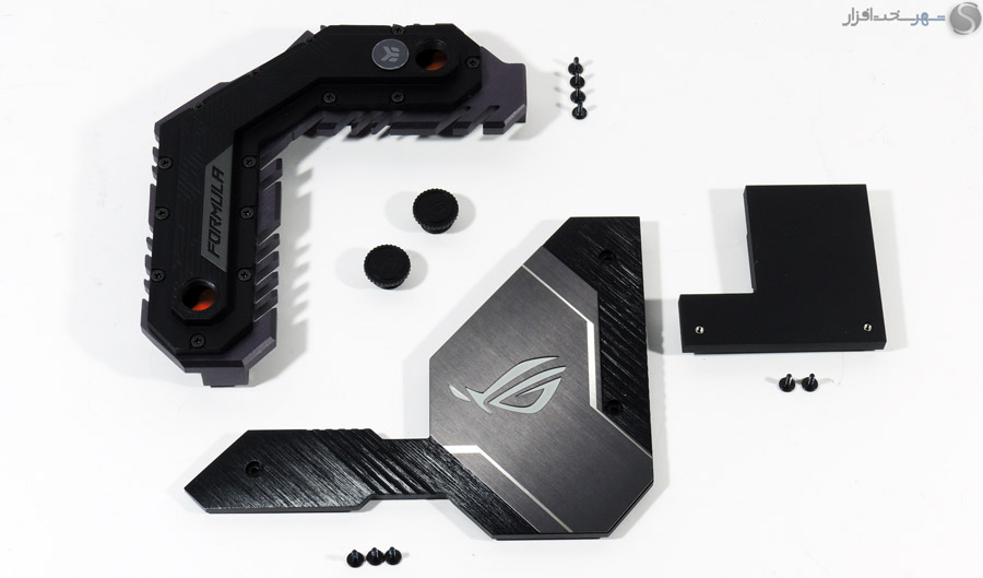 بخش دیگری از وزن زیاد این مادربرد در اثر خنک کننده ویژهی مدار رگولاتور ولتاژ آن است. این خنک کنندهی ترکیبی ساخت شرکت EK است که در زمینه خنک کنندههای آبی شهرت دارد. این خنک کنندهی حجیم و یک پارچه، ضمن کارایی مناسب برای خنک سازی مدار رگولاتور ولتاژ، با ترکیب آلومینیوم برس خوردهی خاکستری و پوشش پلاستیکی مشکی رنگ برای بلاک خنک کنندهی آبی به همراه درپوشهای با نشان ماسک معروف ROG، ظاهری جذاب و چشم نواز به این مادربرد داده است.