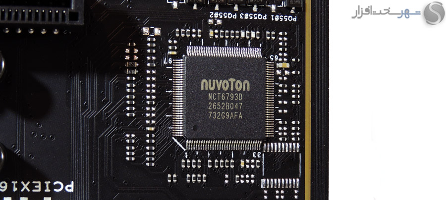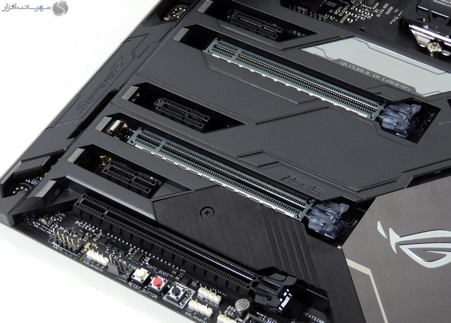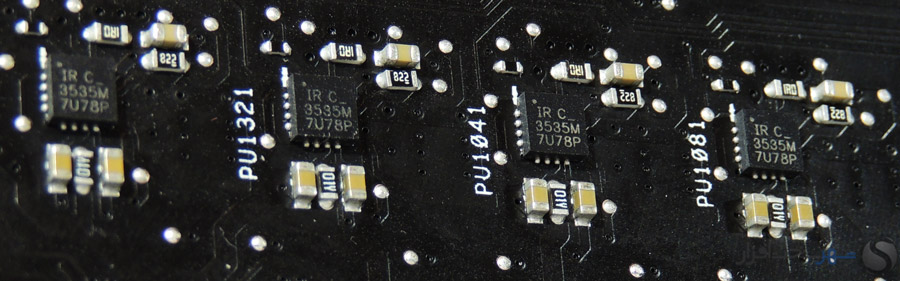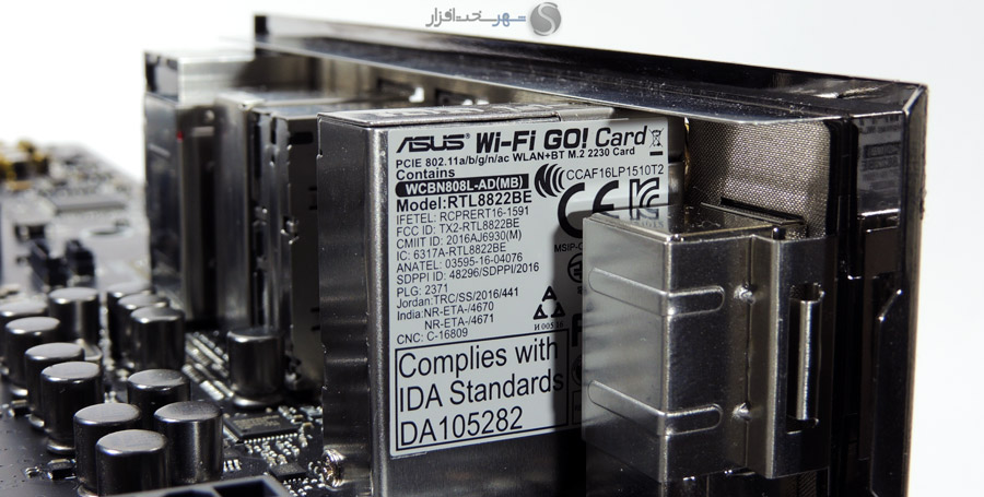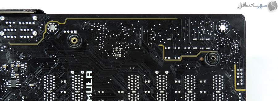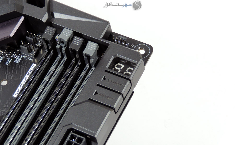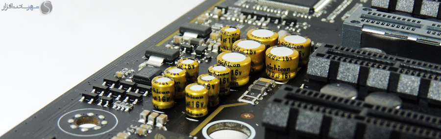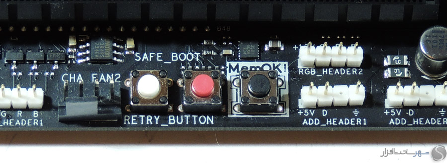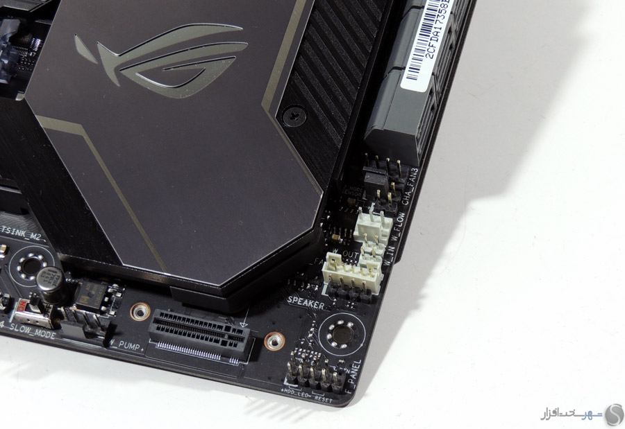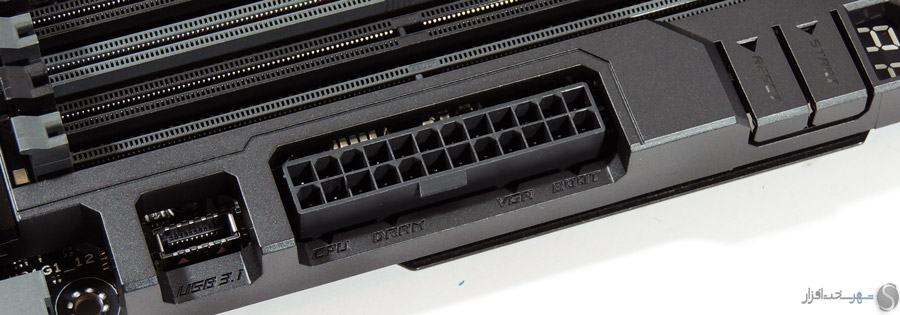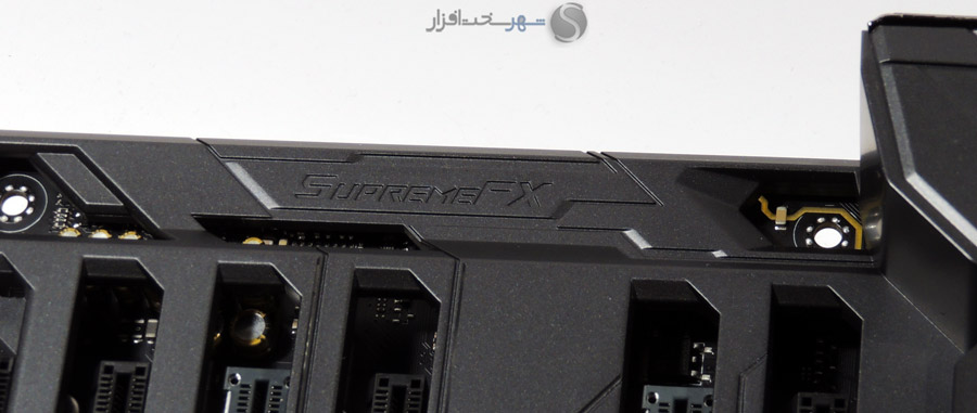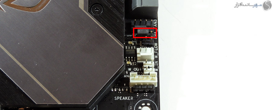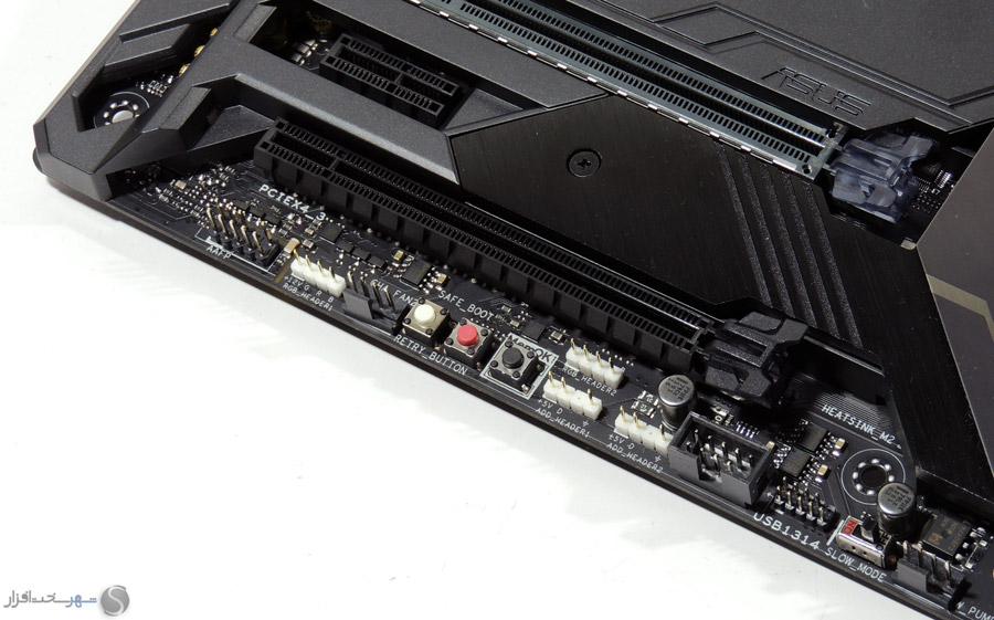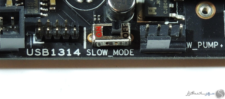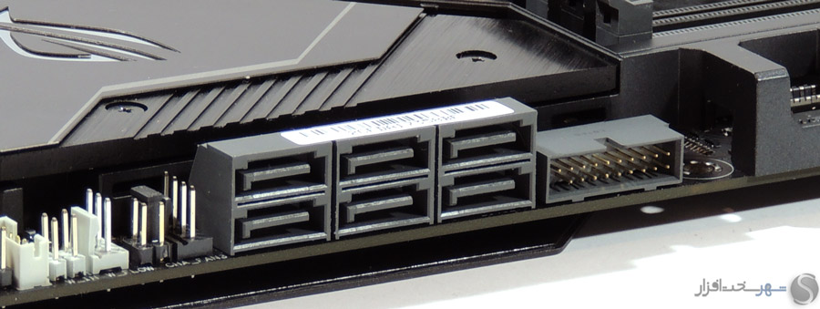 در این بخش انتظار داشتیم مانند دیگر مادربردی که در کلاس High-End در لابراتوار شهر سختافزار مورد بررسی قرار گرفت و همچنین قیمت 450 دلاری این مادربرد، کابلهای بافته شده جایگزین کابلهای معمولی SATA شود یا وسایل کاربردیتری مانند سنسورهای دما یا نشاندهنده شدت جریان آب برای استفاده در خنککنندههای سیکل باز برای این محصول که توجه خاصی به خنککنندههای مایع در طراحی آن شده است، در نظر گرفته میشد.
