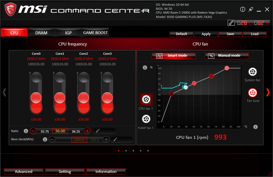 نسل جدید نرم افزار Command Center که در مادربردهای نسلهای قبل کمپانی MSI معرفی شد با کمی تغییرات در محیط گرافیکی، افزایش پایداری و اضافه شدن امکانات جدید همراه با نسل جدید مادربردهای این کمپانی نیز عرضه شده است. همانطور که در تصویر بالا ملاحظه میکنید امکانات این نرم افزار در 4 تب مختلف طبقه بندی شدهاند. در تب اول (CPU) قابلیت تنظیم مهمترین پارامترهای پردازنده، نظیر ضریب فرکانس هستهها، Base Clock و حتی سرعت چرخش فن فراهم شده است.