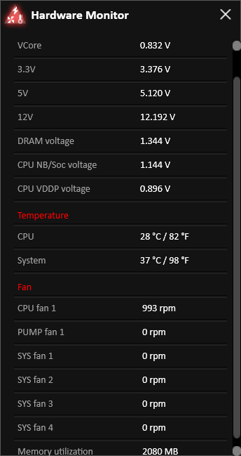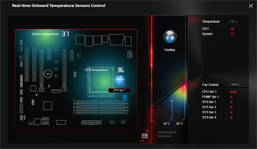 در این بخش بهواسطه حسگرهای حرارتی تعبیه شده در دو بخش مختلف مادربرد حرارت حیاتیترین بخشهای سیستم را بهصورت برخط مانیتور، و تنها با یک کلیک سیستم خنک کننده سیستم را جهت تهویه بهتر تنظیم میکند.