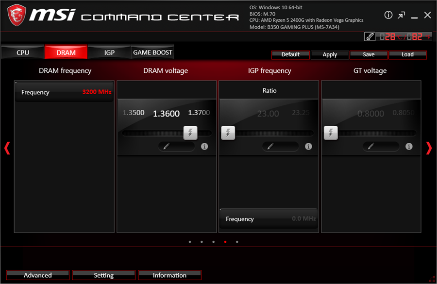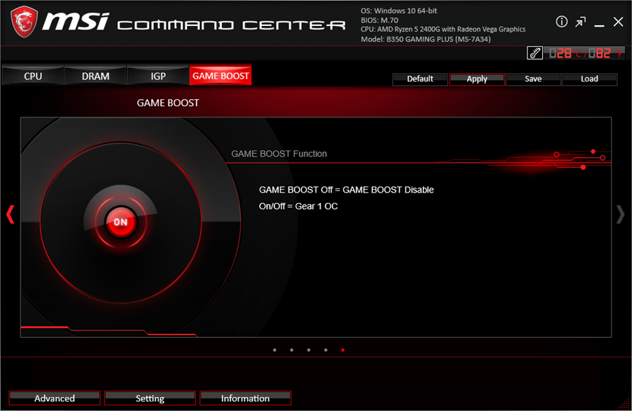 در بخش Game Boost این امکان فراهم شده تا به صورت نرم افزاری قابلیت GAME BOOST را فعال کنید. این قابلیت به شما کمک میکند تا در سریعترین زمان ممکن و به شیوهای راحت، سیستم خود را بدون هرگونه پیچیدگی اورکلاک کنید تا کارایی دریافتشده از پردازنده و رم را افزایش دهید. بدین ترتیب در بازیها نیز نرخ فریم بالاتری کسب خواهد شد. بنابراین گیمرها بدون هیچ دردسری میتوانند سیستم خود را با یک کلیک اورکلاک کنند.