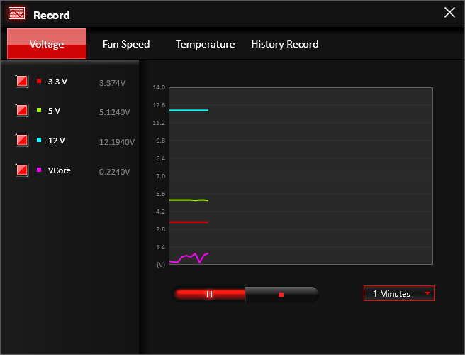 بخش Record نیز تمامی فعل و انفعالات رخ داده در تمامی پارامترهای ولتاژی، حرارتی و سرعت چرخش فنها را در یک فایل مجزا ذخیره کرده تا کاربر یا کاربران سیستم در مواقع لازم بهراحتی توانایی بازبینی این اطلاعات را داشته باشند.