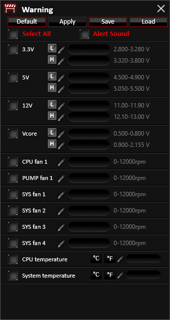 در بخش Warning تمهیداتی اندیشه شده تا در صورت خارج شدن پارامترهای مختلف ولتاژی، حرارتی و حتی سرعت چرخش فنها از محدوده تعیین شده، سیستم هشدار دهنده این نرم افزار کاربر را از مشکل به وجود آمده باخبر سازد. محدوده امن تمامی پارامترها بهصورت پیش فرض تنظیم شدهاند، اما این امکان فراهم شده تا کاربر نیز توانایی تغییر این محدودهها را داشته باشد.