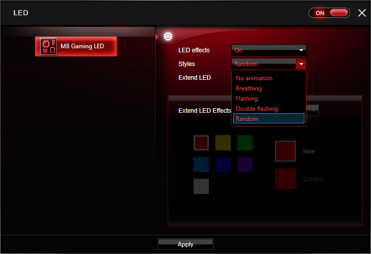 همانطور که در تصویر بالا مشاهده میکنید امکان مدیریت نورهای LED تعبیه شده در پشت مادربرد به همراه نوار RGB قابل اتصال به درگاه روی برد، در بخشی با نام LED گنجانده شده است. این برنامه امکان روشن یا خاموش کردن سیستم نورپردازی یا انتخاب جلوههایی مانند Breathing و ... در اختیار کاربر میگذارد.