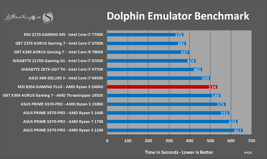 Dolphin Emulator یک شبیه ساز بسیار قدرتمند برای اجرای بازیهای کنسولهای GameCube و Wii در PC آن هم با رزولوشن 1080p میباشد. کارایی بسیار بالا به همراه پشتیبانی از بازیهای آنلاین و تحت شبکه از ویژگیهای ممتاز این شبیه ساز محسوب میشود.عملکرد Benchmark این شبیه ساز به این صورت است که در این بخش الگوریتمی استاندارد و ثابت که شامل رندر یک صحنه پیچیده 3 بعدی با استفاده از تکنیک ray tracing میشود اجرا و زمان سپری شده برای رندر کامل این صحنه ملاک کارایی پردازنده محسوب میشود. البته مد نظر داشته باشید که این نرم افزار کاملاً Multithread نیست و فرکانس و معماری هسته پردازنده مهمترین نقش را در اجرای سریعتر این شبیه ساز بازی میکنند.