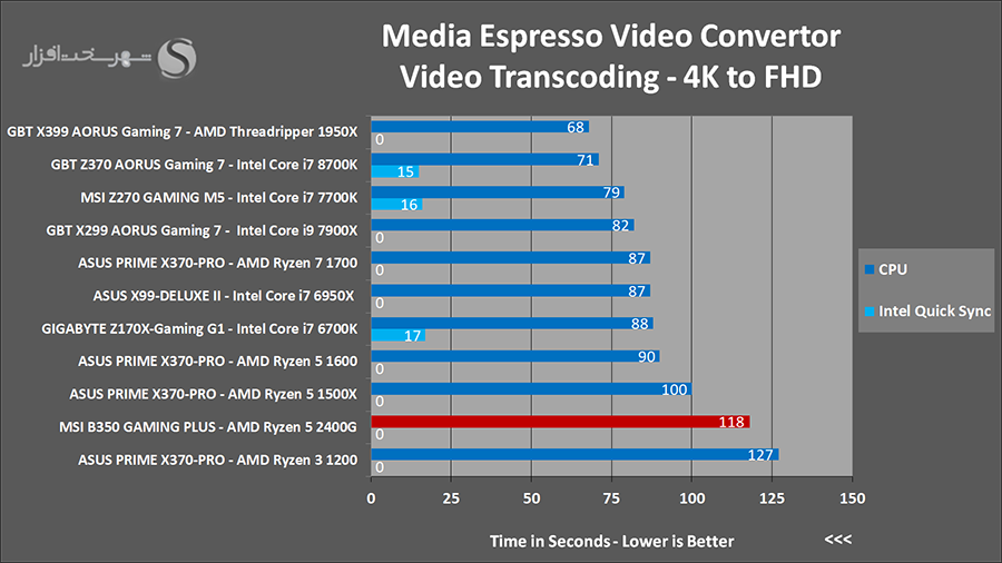 این دو نرم افزار نیز یکی از بهترین و معتبرترین تستهای سنجش کارایی سیستم در پخش و تبدیل فایلهای ویدئویی به فرمتهای مختلف به شمار میروند. پشتیبانی از مدرنترین تکنولوژیها و پربازدهترین الگوریتمها جهت تبدیل قابلهای ویدئویی با بالاترین سرعت و در عین حال باکیفیتترین حالت ممکن از مهمترین ویژگیهای این دو نرم افزار محسوب میشوند.در نرم افزار CyberLink MediaEspresso از توان CPU برای تبدیل یک فایل ویدئویی باکیفیت 2160p با فرمت MP4 و کمک AVC1 با حجم 481MB به استاندارد ویدئویی 1920x1080 در Youtube استفاده شده است. همچنین در تست نرم افزار HandBrake از توان CPU برای تبدیل یک فایل ویدئویی باکیفیت 2160p با فرمت MP4 و کمک AVC1 با حجم 481MB به ویدئویی با کیفیت 1080p با فرمت MKV و کدک H265 استفاده شده است.