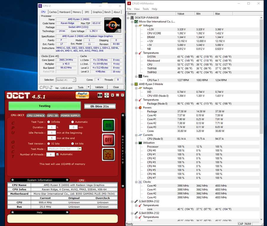 در این بخش بر خلاف روال گذشته و تعیین یک ولتاژ ثابت برای همه مادربردها تصمیم گرفتیم تا ابتدا پتانسیل اورکلاک پردازندههای با این معماری را بسنجیم. به همین منظور ابتدا تمامی پارامترها و قابلیتهای مرتبط با Power Saving را غیرفعال کردیم و در ادامه پس از حدود 1 ساعت آزمایش پروفایلهای مختلف بر روی این مادربرد در فرکانس 4.0GHz و ولتاژ هسته 1.45V در Bios به تعادل و پایداری کامل رسیدیم.در تصویر زیر تست پایداری این پردازنده را در فرکانس فوق مشاهده می کنید: