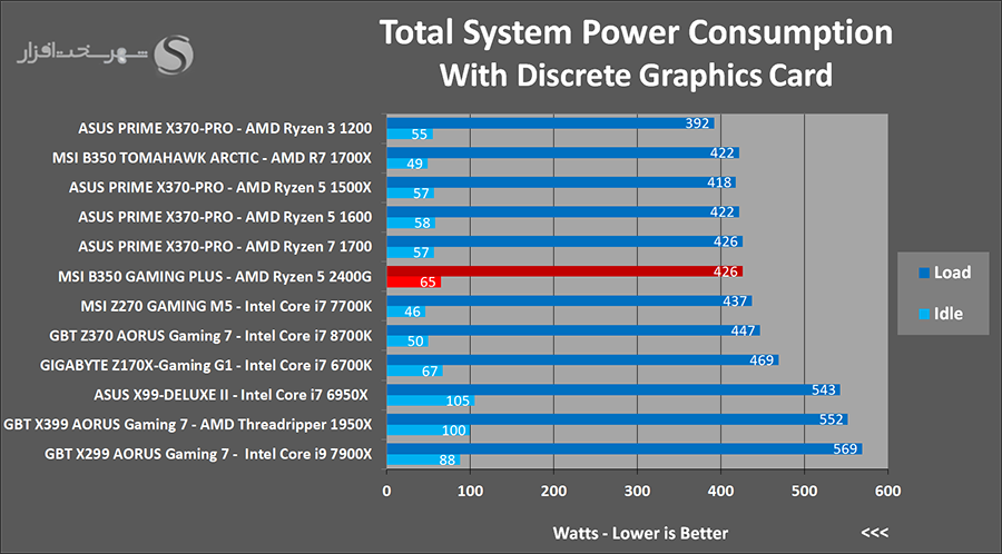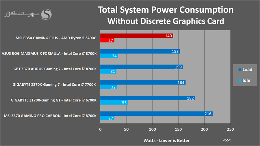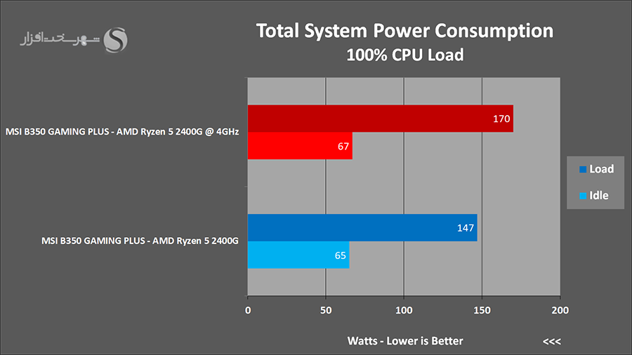 نتایج گویای این مطلب هستند که به خصوص در وضعیت عدم نصب کارت گرافیک مجزا به صورت کلی با پلتفرمی فوق العاده کم مصرف روبرو هستیم. به بیانی دیگر پردازنده AMD Ryzen 5 2400G بدون شک در حال حاضر یکی از کم مصرف ترین و در عین حال قدرتمندترین IGP های حال حاضر را با خود به همراه دارد. البته در حالت نصب کارت گرافیک مجزا مصرف حالت بی کاری سیستم کمی بیشتر از حد انتظار ما ثبت شده است. در واقع با توجه به میان رده بودن مادربرد و عدم تعبیه تراشه های مجزا متعدد بر روی آن، این میزان توان مصرفی نیاز به مدیریت بیشتری دارد.