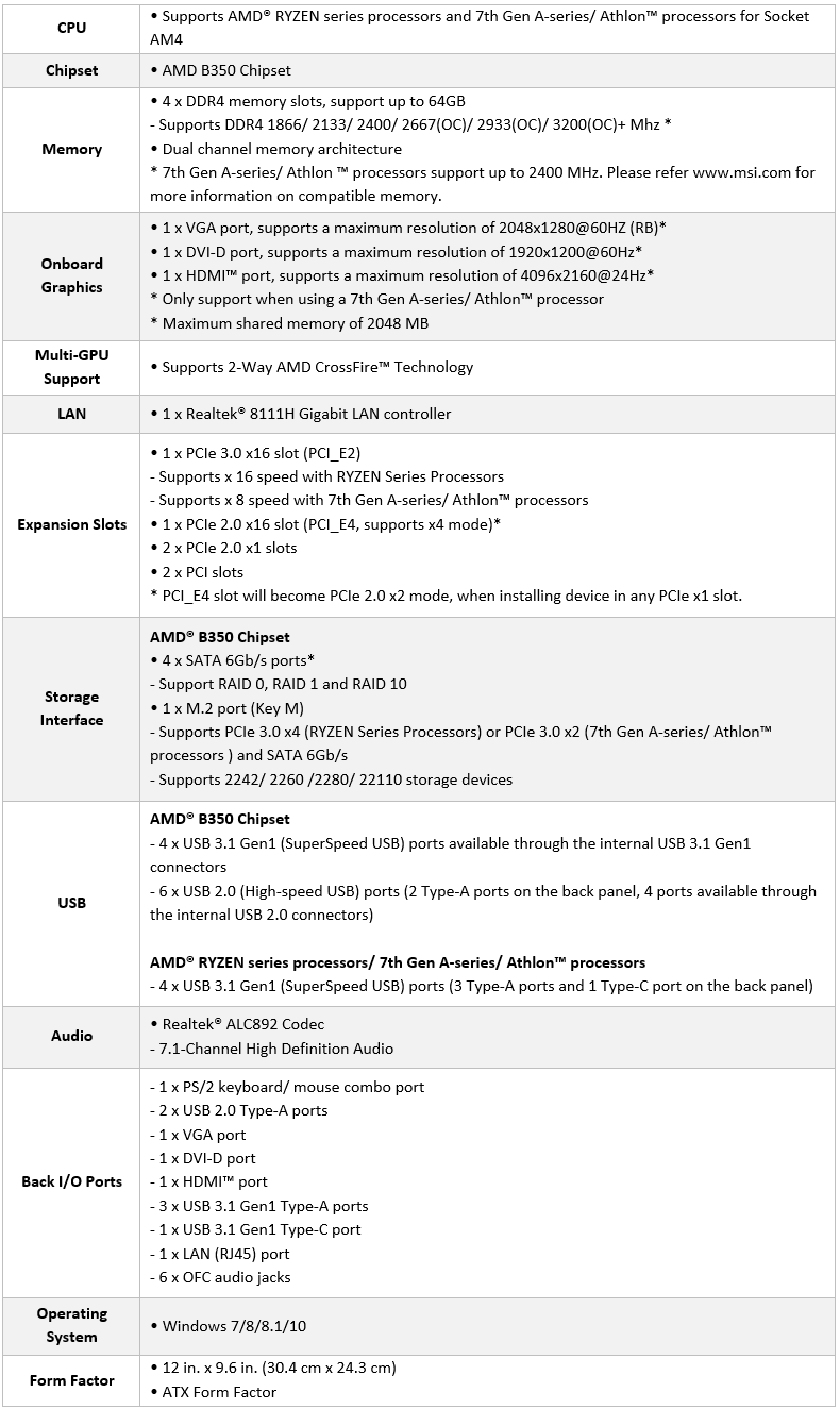 چیپ ست B350 قادر به ارائه 2 درگاه USB 3.1 نسل یک با پهنای باند 10 گیگابیت بر ثانیه، 6 درگاه USB 3.0،ا6 درگاه USB 2.0 و 2 درگاه SATA III با پهنای باند 6 گیگابیت بر ثانیه است. این چیپ ست از اورکلاکینگ پردازنده و پیکربندی CrossFire پشتیبانی می کند.