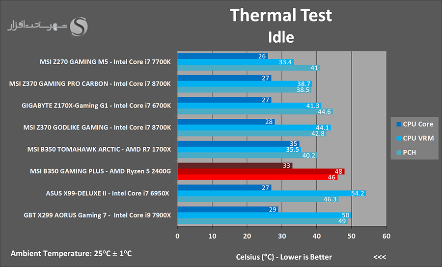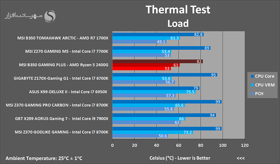 در این تست نیز حرارت متصاعد شده از داغترین نقطه هیتسینک ها و قطعات مدار رگولاتور ولتاژ پردازنده (CPU VRM) و هیتسینک چیپست AMD B350 را بهوسیله ترمومتر مادون قرمز و حرارت هسته CPU را نیز بهوسیله نرم افزار HWMonitor در دو وضعیت Idle (ا15 دقیقه بدون هیچ گونه فعل و انفعال) و Load کامل CPU و GPU (بهواسطه 15 دقیقه اجرای هم زمان تست CPU: OCCT و تست Burn-in نرم افزار FurMark) اندازه گیری و ثبت کردیم. نتیجه به دست آمده به شرح زیر است: