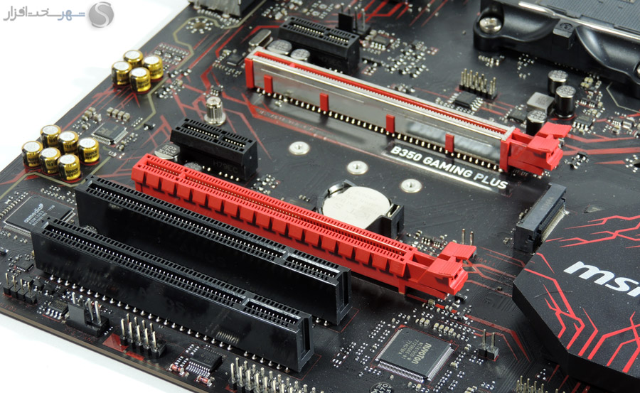 در زمینه اسلاتهای PCI با دارا بودن دو اسلات PCI Express X16، یک اسلات PCI Express X1 و دو اسلات PCI قابلیت نصب انواع کارتهای افزودنی وجود دارد. اسلات اول PCI Express X16 پهنای باند خود را مستقیماً از پردازنده دریافت میکند و با توجه به پردازنده مورد استفاده سرعت X16 یا X8 را ارائه خواهد داد. اسلات دوم نیز پهنای باند خود را از چیپ B350 دریافت کرده و سرعت X4 تحت استاندارد PCIe 2.0 دارد. همچنین با توجه به محدودیتهای خطوط PCI-E، تنها از قابلیت 2way Crossfire پشتیبانی میشود.