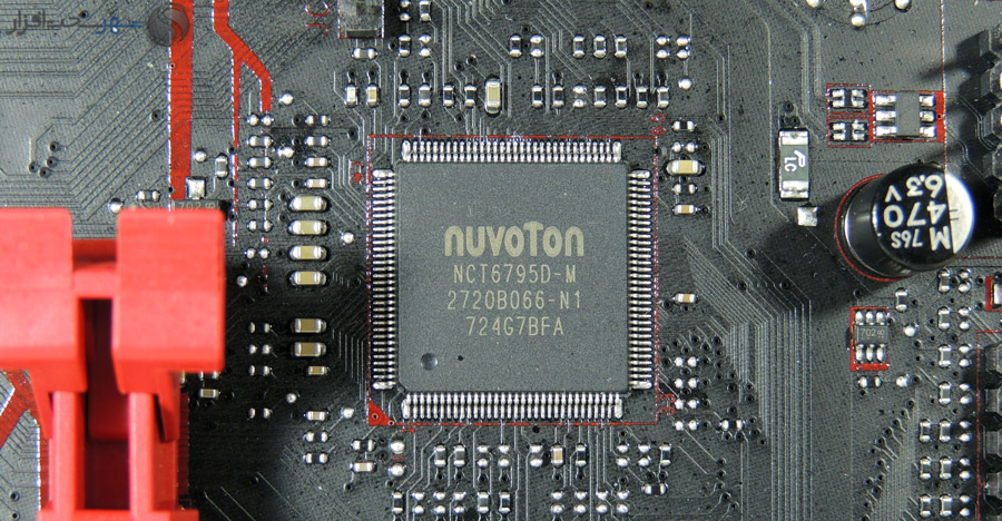 همانطور که در تصویر مشاهده میفرمایید جریان مورد نیاز پردازنده در این مادربرد از طریق یک کانکتور E-ATX 8pin تامین شده و سیستم VRM، تنظیم و تصفیهی این ورودی را انجام میدهد. مدار رگولاتور ولتاژ این مادربرد از نوع 2+4 فاز بوده که 4 شریان وظیفه تامین ولتاژ و جریان مورد نیاز پردازنده (VCC) را بر عهده دارند و 2 شریان، ولتاژ و جریان مورد نیاز سایر کنترلرها و تراشههای تعبیه شده در پردازنده (SoC) را تامین میکنند که توسط چوکهای با هسته فریتی و خازنهای Black Solid تصفیه شده و به پردازنده میرسد.