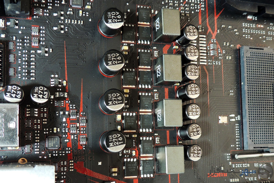 ماسفتهای به کار رفته در این مدار از مدل PK632BA برای بخش LowSide و PK616BA برای بخش HighSide بوده و ساخت Niko Semiconductor هستند. این ماسفتها در بیشتر مدارهای رگولاتور ولتاژ مادربردهای میان رده مشاهده میشود و استفاده از آن در یک مادربرد Entry Level امتیازی مثبت به حساب میآید. ترکیب دو ماسفت به عنوان Lowside برای بخش Vcore و توان تأمین جریان 70A بصورت مداوم این ماسفتها در 4 فاز، توانایی تحویل بیشینه جریان 280A به پردازنده را ممکن ساخته که قابلیت اورکلاک مناسبی را حتی برای پردازندههای 8 هستهای سری رایزن بدون تحمیل فشار غیر متعارف به سیستم VRM ایجاد میکند.