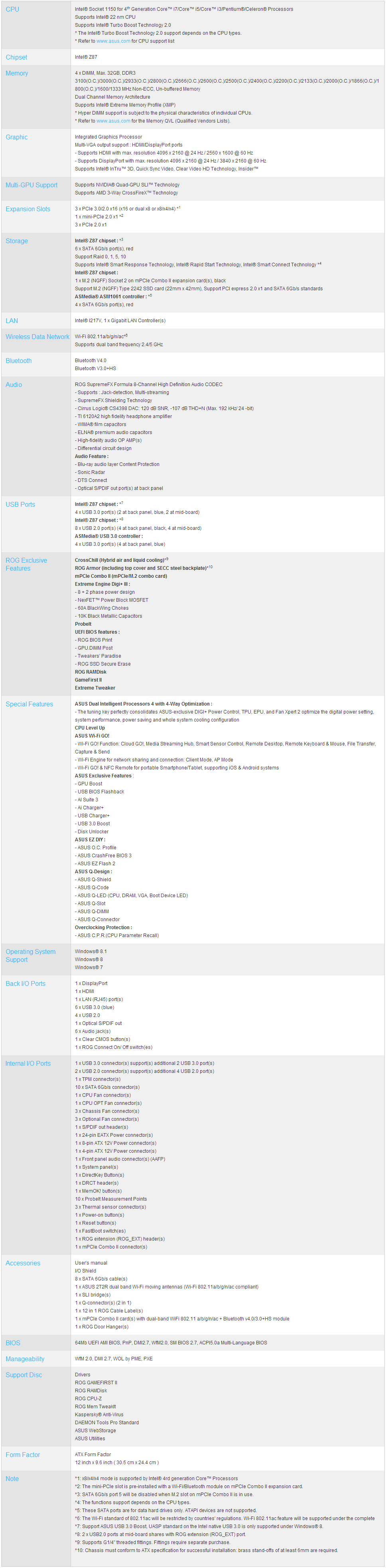Formula تقریبا تمامی امکانات و قابلیت های یک مادربرد مدرن نظیر WiFi 802.11 a/b/g/n/ac، Bluetooth v4.0/3.0+HS، پورت های متععد USB 3.0 و SATA 3.0 ، مدار رگولاتور ولتاژ پردازنده با کیفیت و مدرن برای اورکلاک حرفه ای پردازنده، سیستم خنک کننده فوق العاده خاص و بی نظیر کمپانی ASUS و سیستم صوتی فوق العاده با کیفیت SupremeFX Formula را دارا می باشد و با این وجود در مقایسه با مدل های مشابه کمپانی های رقیب قیمت بسیار مناسبی نیز دارد.
