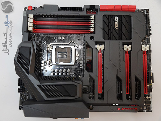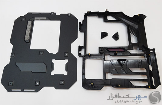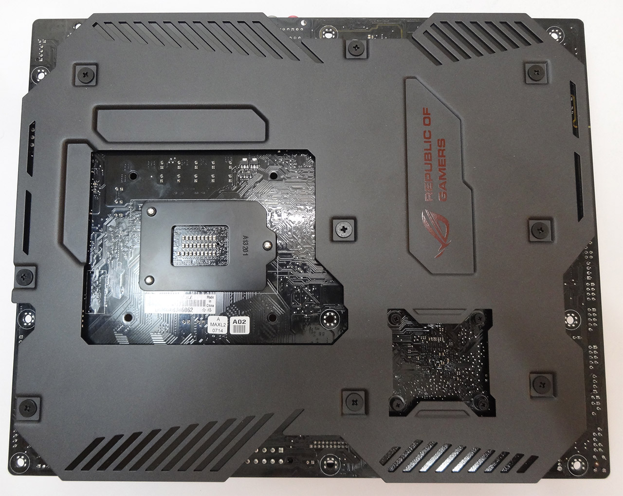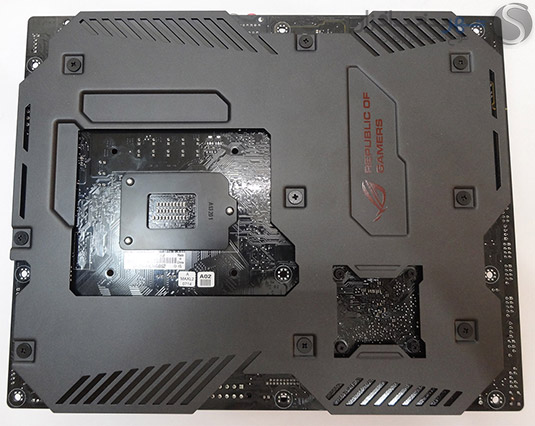 همانطور که در تصاویر بالا ملاحضه می کنید سرتاسر این مادربرد با پوششی با جنس پلاستیک ABS تحت عنوان ROG Armor پوشیده شده است. اما این پوشش فقط جنبه نما و زیبایی ظاهری ندارد. بلکه مانع از تاثیر مستقیم گرمای دفع شده از سوی کارت های گرافیک بر روی قطعات مختلف روی PCBمی شود. اما ROG Armor یک بخش دیگر نیز دارد که در قسمت پشتی PCB تعبیه می شود.