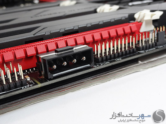 همچنین در بخش پایینی PCB یک کانکتور 4Pin Molex تعبیه شده است که PCIe Power Connector نامیده می شود و در اصل کار آن تامین انرژی اضافی مورد نیاز برای اسلات های PCI-Express x16 در پیکربندی های چند گانه Multi GPU می باشد.