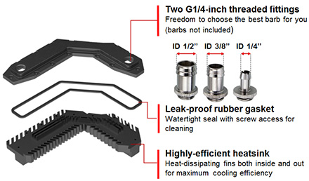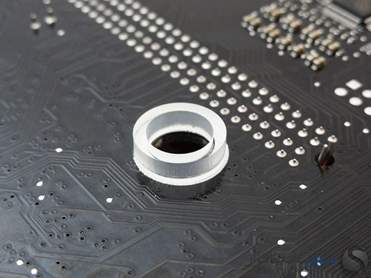 همانطور که ملاحضه می کنید بر روی هیتسینک تعبیه شونده بر روی مدار رگولاتور ولتاژ دو عدد سوراخ با استاندارد ابعاد G1/4 تعبیه شده که می توان از ان برای پیچ کردن سر لوله های مختلف شلنگ خنک کننده های آبی استفاده کرد.