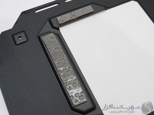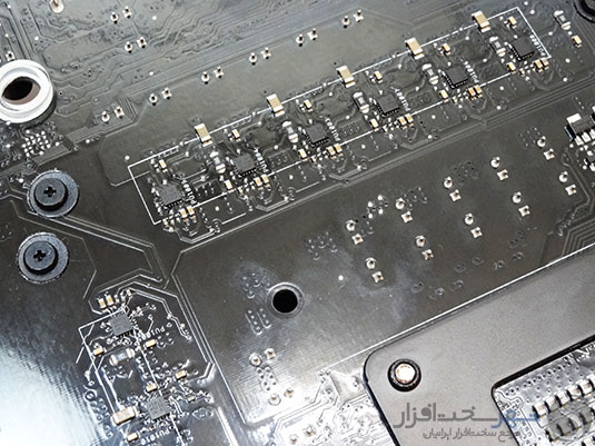 در تصویر بالا چسب حرارتی تعبیه شده برای انتقال بهتر گرما از درایورهای ماسفت تعبیه شده در پشت PCB به ROG Armor را ملاحضه می کنید.