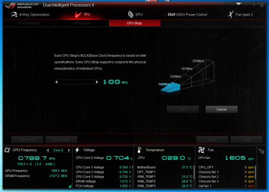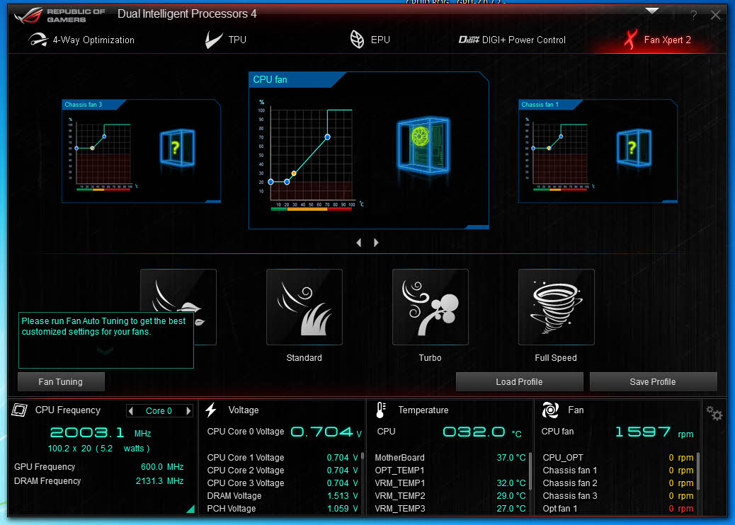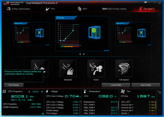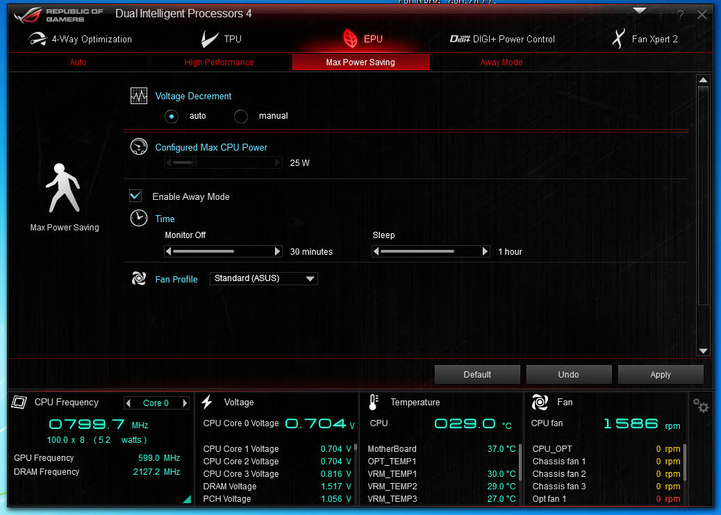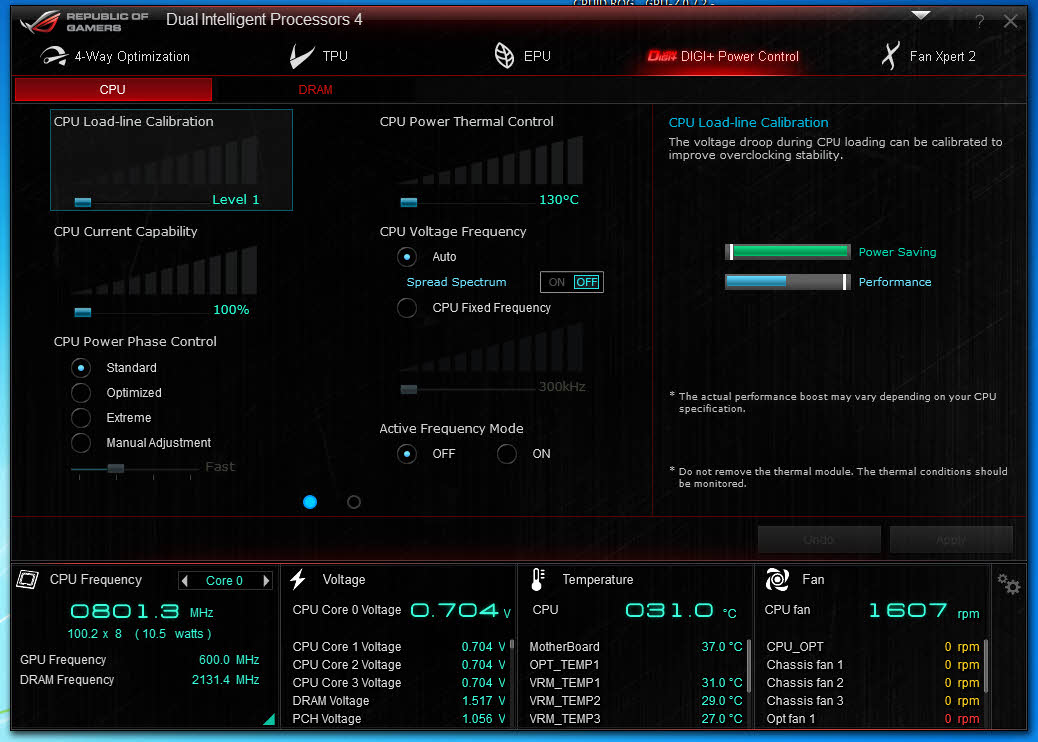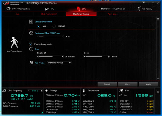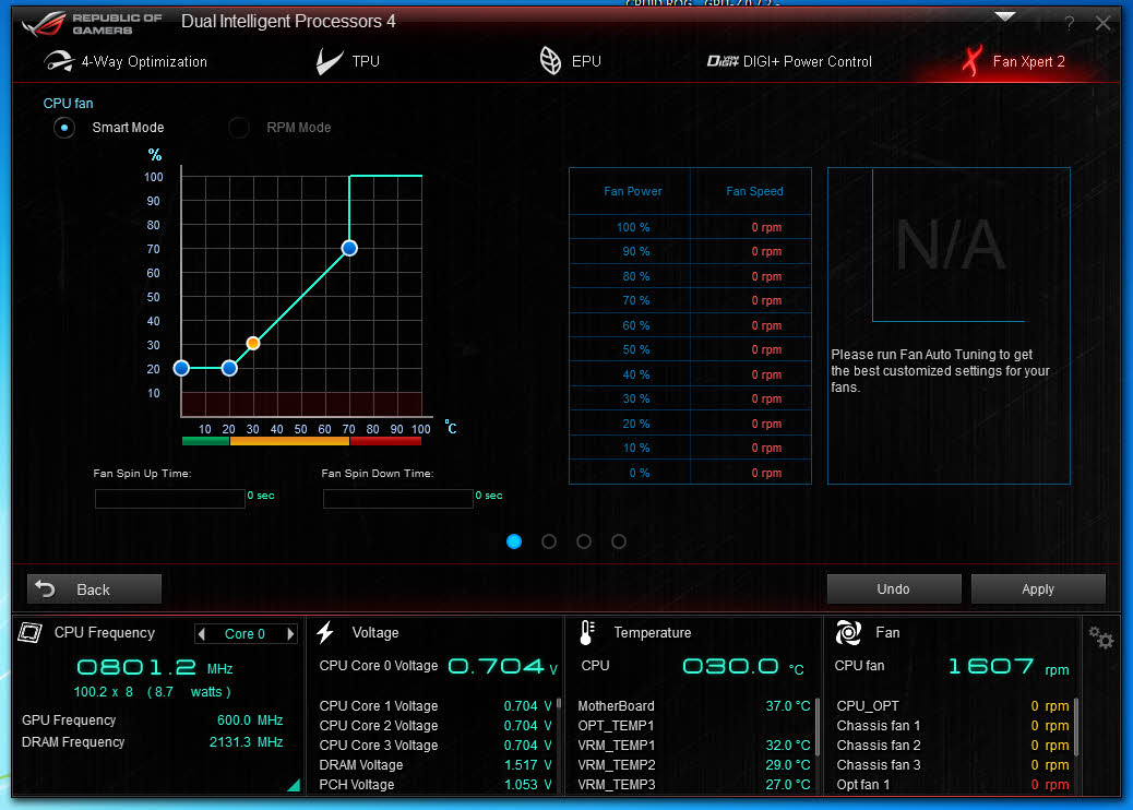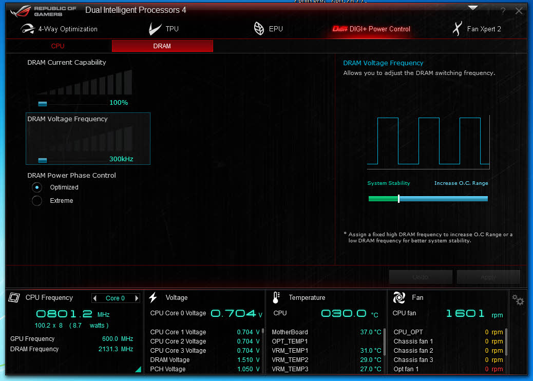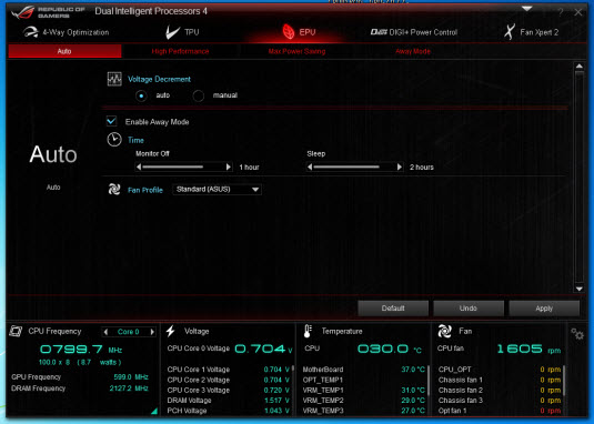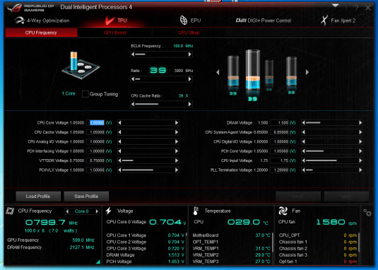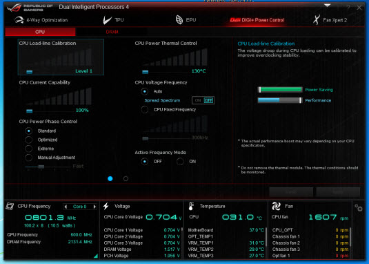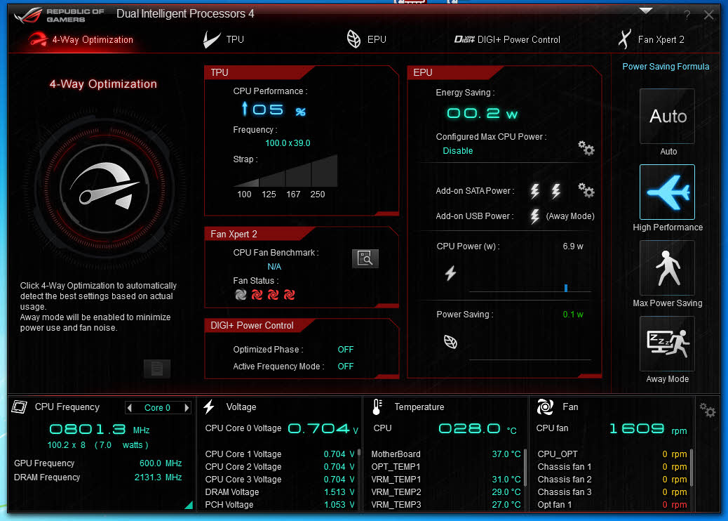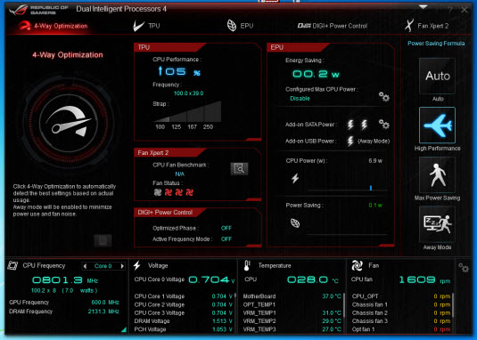 همانطور که در تصویر بالا ملاحضه می کنید، امکانات این نرم افزار در 5 تب تحت عنوان های 4Way Optimization، TPU، EPU، DIGI+ Power Control و FAN Xpert 2 طبقه بندی شده اند. در صفحه اول سعی شده تا امکانات راهبردی برخی از تب ها به همراه مانیتورینگ ولتاژ، حرارت، سرعت چرخش فن ها و فرکانس های بخش های مختلف نظیر فرکانس هسته پردازنده، رم ها و BCLK به صورت فشرده نمایش داده شوند.