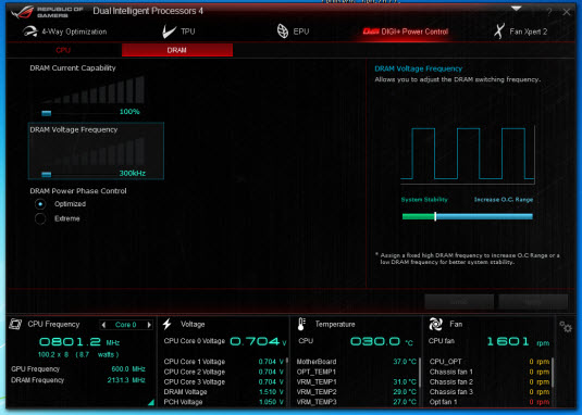 در بخش DIGI+ Power Control نیز این قابلیت فراهم شده تا برخی از تنظیمات و محدودیت های مدار رگولاتور ولتاژ پردازتده و ماژول های حافظه مانند محدودیت های جریان، توان، حرارت به صورت دستی قابل تنظیم باشند و حتی با تنظیم فرکانس سیگنال PWM پتانسیل ارائه توان های بیشتر از مقادیر استاندارد برای اینگونه مدارات فراهم شود.