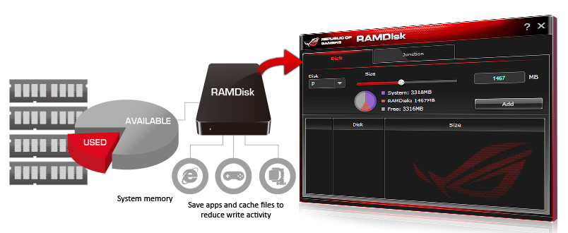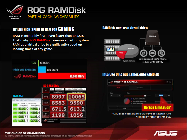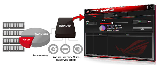 ROG RAMDisk این امکان را برای کاربر فراهم می سازد تا حداکثر از 80% فضای خالی RAM به عنوان یک Storage بسیار پرسرعت استفاده کند. ار آنجا که پهنای باند حافظه های RAM به صورت میانگین 20 برابر بیشتر از پرسرعت ترین SSD های کنونی می باشد با این کار سرعت عملکرد سیستم عامل و بسیاری از نرم افزار ها به صورت فوق العاده محسوسی افزایش می یابد.