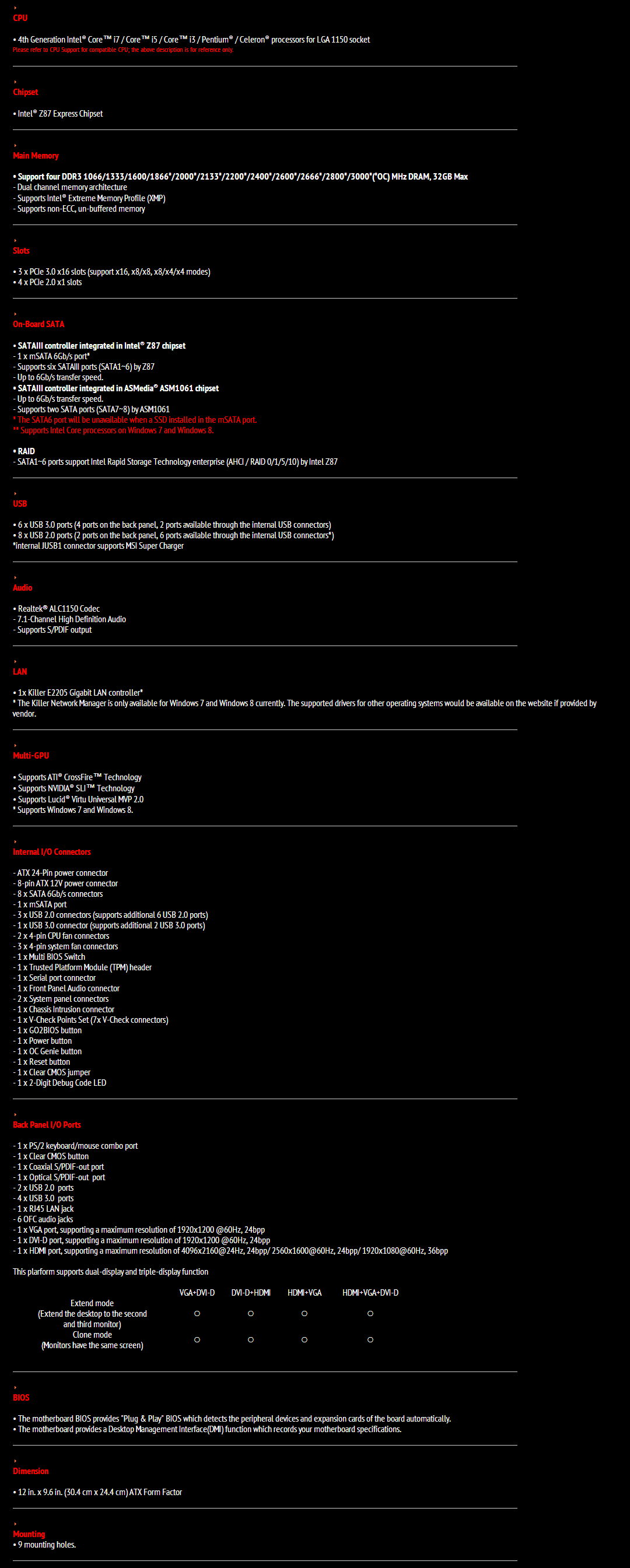 خروجی های تصویر را در پنل پشتی مادربرد، پورت های HDMI 1.4a ، DVI-D و D-Sub تشکیل می دهند. 4 پورت USB 3.0 موجود در این پنل نیز از چیپست PCH Z87 منشعب شده اند.