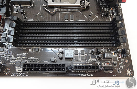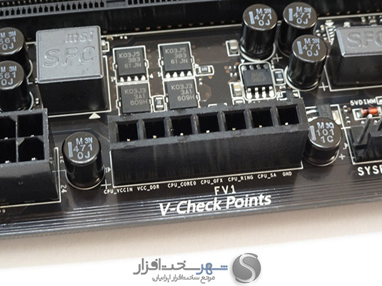 دقیقا در کنار کانکتور 24Pin این مادربرد، کانکتوری تحت عنوان V-Check Points تعبیه شده است. همانطور که در ابتدای مقاله به آن اشاره شد با استفاده از V-Check Cable های موجود در بسته بندی این مدل، این قابلیت فراهم شده تا بتوان ولتاژ بخش های مختلف پردازنده نظیر CPU_VCCIN، CPU_Core0، CPU_GFX ،CPU_RING CPU_SA و ولتاژ ماژول های حافظه ( VCC_DDR ) را با استفاده از ولتمترهای دیجیتال اندازه گیری کرد.