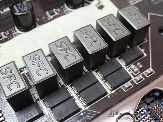 در تصویر بالا نمایی بسته از کامپوننت های به کار رفته در مدار رگولاتور ولتاژ پردازنده این مادربرد به همراه کانکتور 8Pin EPS تامین کننده انرژی این مدار را ملاحضه می کنید. اما این قطعات که شامل Hi-c Cap, Super Ferrite و Solid Dark Caps می شوند دارای چه ویژگی هایی هستند :
