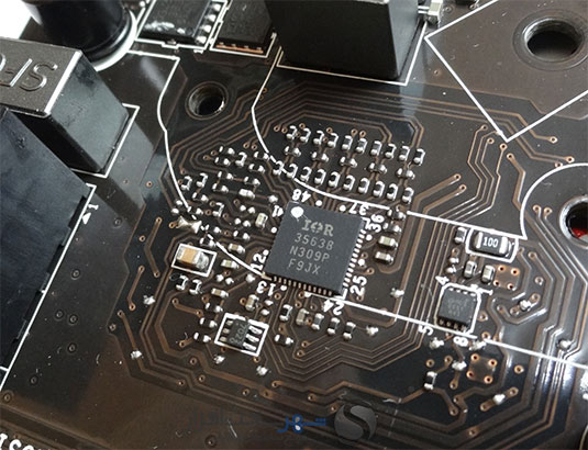 همانطور که در تصویر بالا ملاحضه می کنید، PWM Controller در نظر گرفته شده برای این مادربورد مدل 3563B از نوع 8-Phase Digital PWM Controller ساخت کمپانی International Rectifier می باشد. این چیپ ضمن پشتیبانی از استانداردهای VRD 12، VRD 12.5 کمپانی اینتل از پروتکشن های OVP, UVP, OCP, OTP و CFP نیز پشتیبانی می کند. همچنین سرعت سوئیچنگ این چیپ نیز از 200 KHz تا 2MHz قابل تنظیم خواهد بود.