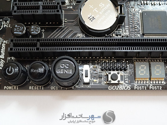 دقیقا پایین ترین نقطه PCB این مدل 4 عدد سوئیچ و یک کلید دو حالته به همراه دو عدد سون سگمنت تعبیه شده است. همانطور که در تصویر بالا ملاحضه می کنید، از سمت چپ به راست به ترتیب سوئیچ Power برای خاموش و روشن کردن سیستم، سوئیچ Reset برای راه اندازی مجدد سیستم به صورت سخت افزاری و سوئیچ OC GENIE برای اورکلاک خودکار سیستم تعبیه شده اند. این 3 کلید تحت عنوان Easy Button 3 توسط کمپانی MSI نامگذاری شده اند.