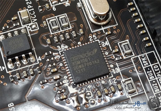 همانطور که در ابتدای مقاله به آن اشاره شد 1 عدد کنترلر SATA 6Gb/s مدل ASM1061 ساخت کمپانی ASMedia روی هم رفته 2 عدد پورت SATA 6Gb/s اضافه بر 6 پورت منشعب از چیپست PCH Z87 برای این مادربرد فراهم می کند، در تصویر بالا این چیپ را ملاحضه می کنید.