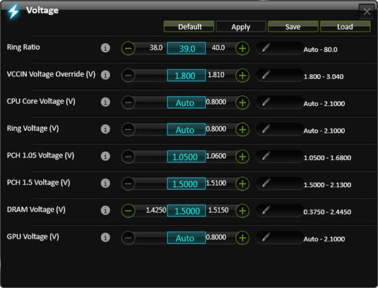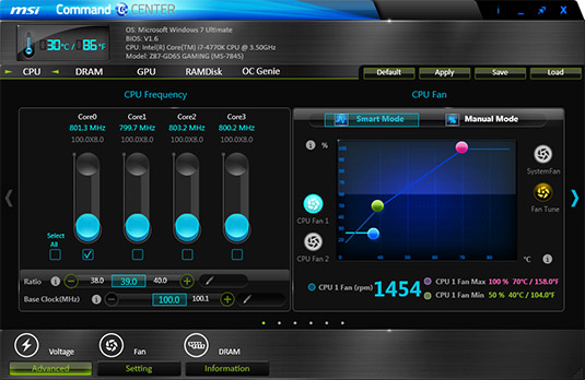 همانطور که در تصویر بالا ملاحضه می کنید امکانات این نرم افزار در 5 تب مختلف طبقه بندی شده اند. در تب اول (CPU ) قابلیت تنظیم مهم ترین پارامترهای پردازنده، نظیر ضریب فرکانس هسته ها، Base Clock و حتی سرعت چرخش فن فراهم شده است.