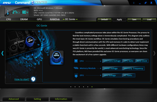 با فشردن کلید OC GENIE در حالی که سیستم خاموش است، مادربرد در اولین بوت به صورت خودکار و کاملا ایمن اقدام به اورکلاک سیستم می کند. البته با اعمال تغییرات در Bios این مادربرد می توانید تا حدودی برخی تنظیمات این بخش را به صورت دستی تغییر دهید.