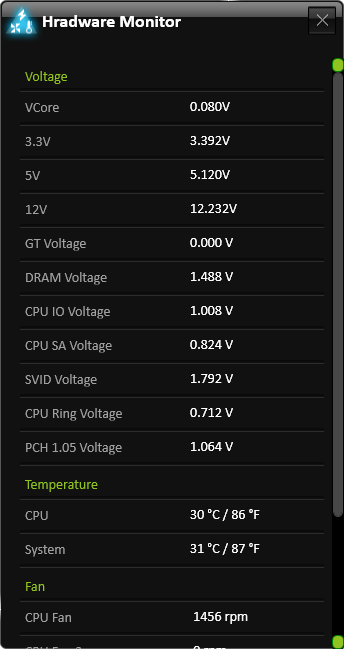 با انتخاب گزینه Advanced در پنجره این بخش می توانید به جزئیات پارامترهای ولتاژی ، سرعت چرخش فن ها و تنظیمات تایمینگ ماژول های حافظه دسترسی داشته باشید.
