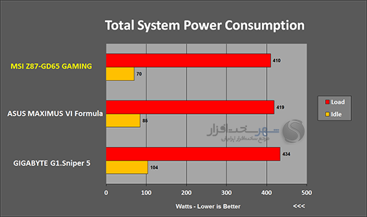 در این تست در حالت Idleا ( 15 دقیقه بدون هیچ فعل و انفعال از طرف کاربر) و Load ( پس 15 دقیقه اجرای تست Power Supply نرم افزار OCCT در ابعاد Full HD ) مقادیر حداقل و حداکثر توان مصرفی کل سیستم را ثبت کردیم. لازم به ذکر است تست Power Supply نرم افزار OCCT مشترکا CPU و GPU را تحت فشار قرار می دهد.