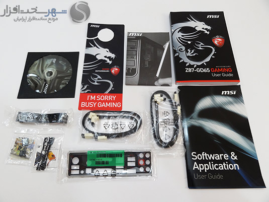 همانطور که در تصویر بالا ملاحضه می کنید، محتویات موجود در جعبه این مادربرد به این شرح می باشند :