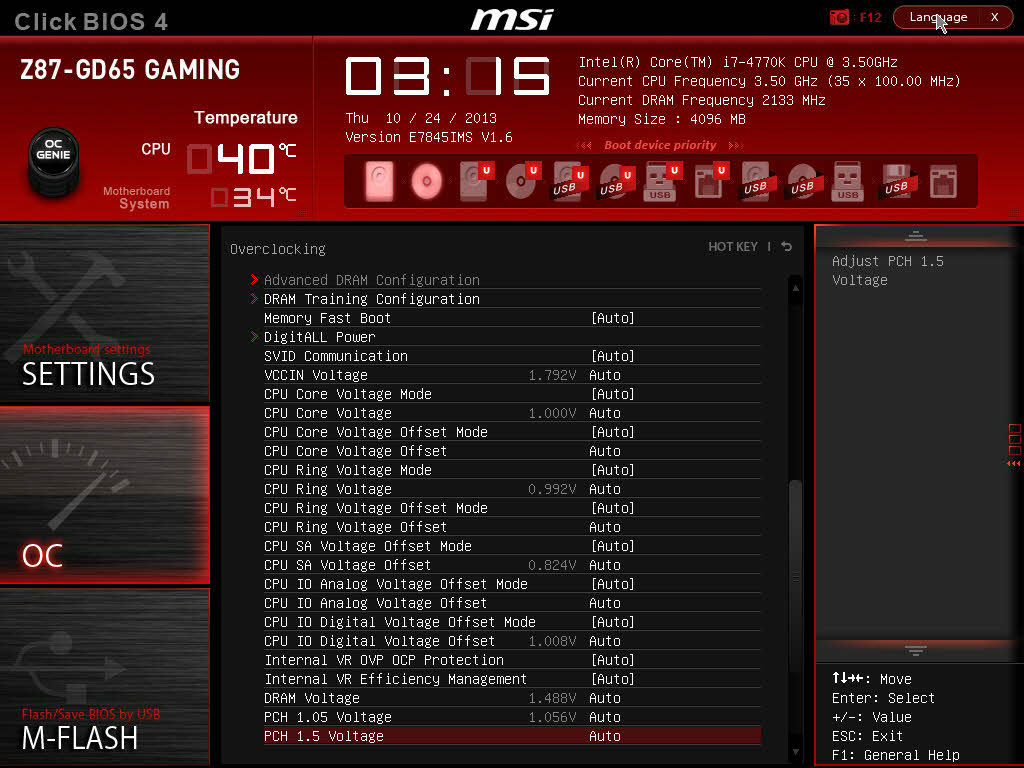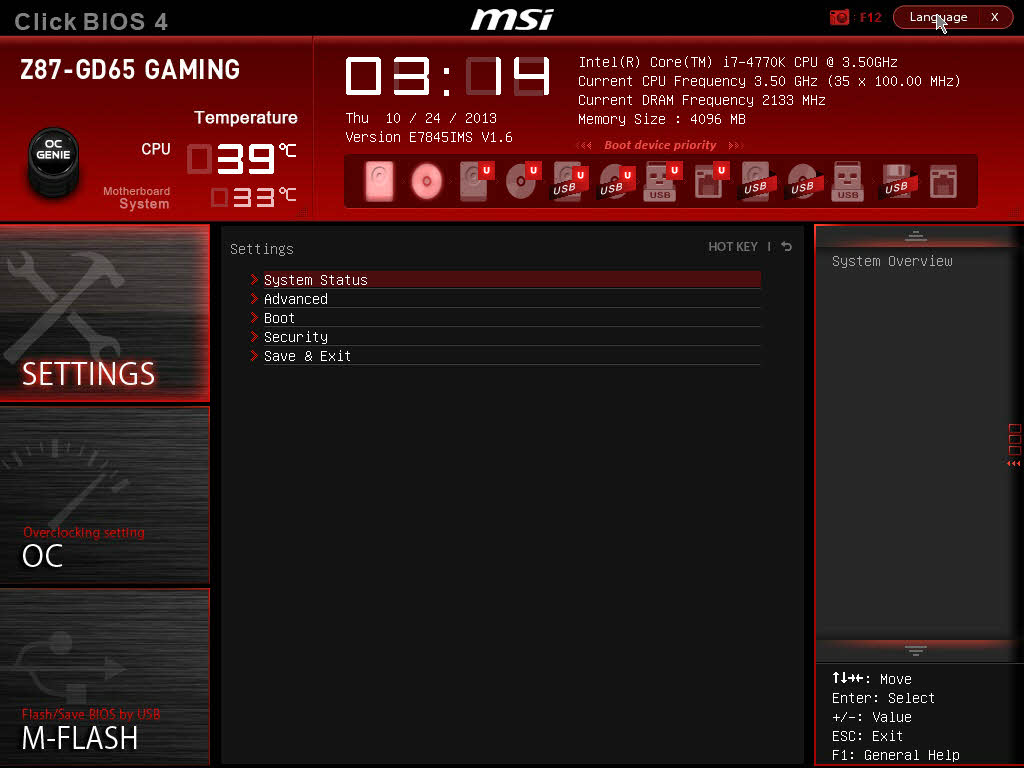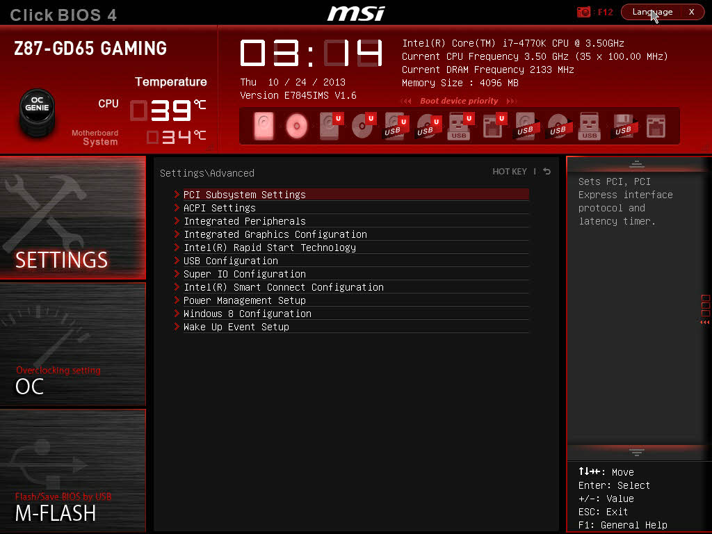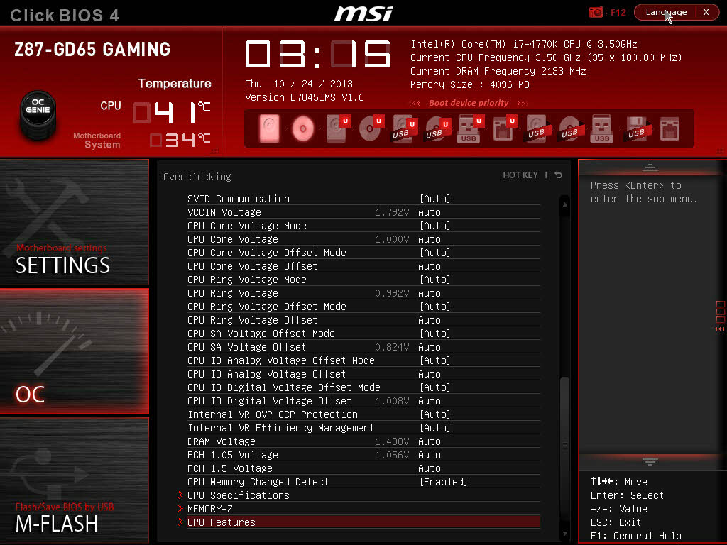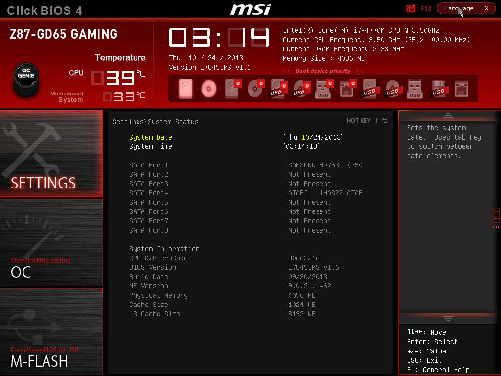 همچنین مهم ترین مشخصات فنی سیستم به همراه مانیتورینک حرارت پردازنده و چیپست PCH Z87 نیز در بالای صفحه Bios درج شده اند.