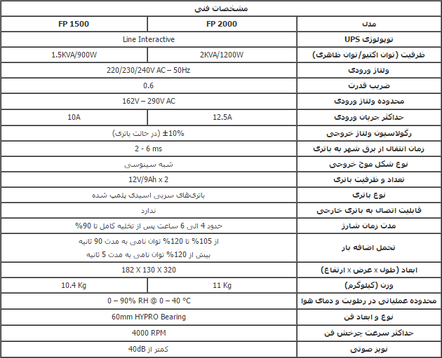 همانطور که در جدول ذکر شده FP2000 یک یو پی اس با توپولوژی Line-Interactive و همانند اغلب مدلهای هم رده خود با ضریب قدرت 0.6 است. این بدین معناست که اینورتر (مبدل جریان DC به AC) این یو پی اس فاقد مدار تصحیح ضریب قدرت یا PFC میباشد. همین عامل نیز باعث شده تا توان عملیاتی این دستگاه 2000VA در عمل 1200W ذکر شود. علاوه بر این شکل موج خروجی این دستگاه نیز شبه سینوسی است و زمان انتقال قدرت از برق شهر به باتری نیز بین 2ms تا 6ms ذکر شده است. این بدین معناست که به دلیل شکل موج خروجی شبه سینوسی توصیه میشود از اتصال بارهای حساس مانند تجهیزات آزمایشگاهی و ابزار دقیق به این یو پی اس خودداری شود. البته زمان انتقال بسیار پایین این دستگاه در مقایسه با مدلهای مشابه یکی از نقاط قوت آن محسوب میشود.