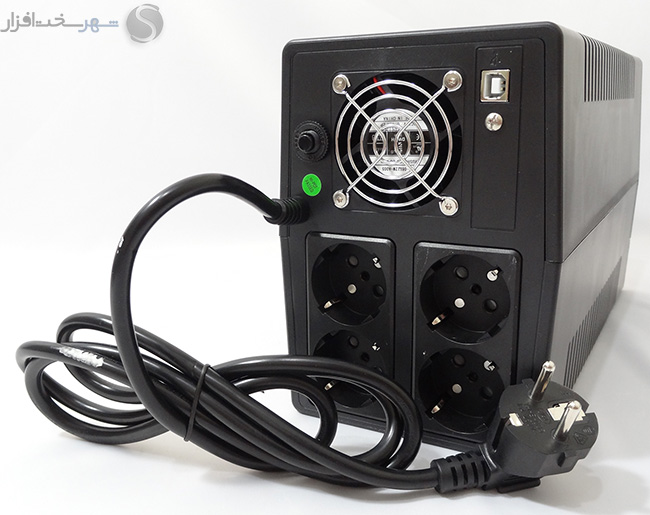 در پنل پشتی این یو پی اس نیز کابل برق ورودی، 4 پریز ارتدار، فیوز ورودی، فن دستگاه و پورت USB جهت اتصال به PC تعبیه شده است.