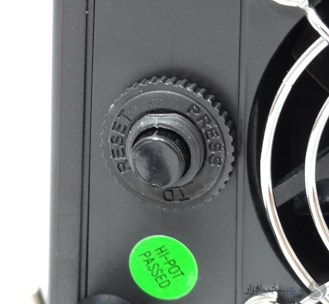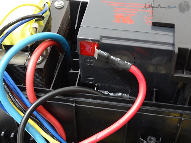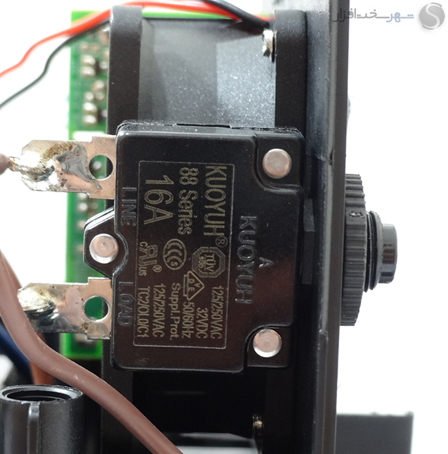 در تصویر بالا نیز مدار شکن حساس به حرارت این UPS را مشاهده میکنید. این فیوز 16A با قابلیت بازیابی که ساخت کمپانی تایوانی KUOYUH میباشد علاوه بر عملکرد مشابه فیوزهای معمولی در صورت افزایش حرارت محیط، ضریب حداکثر مقدار جریان قابل تحمل خود را نیز کاهش میدهد.